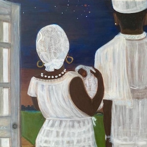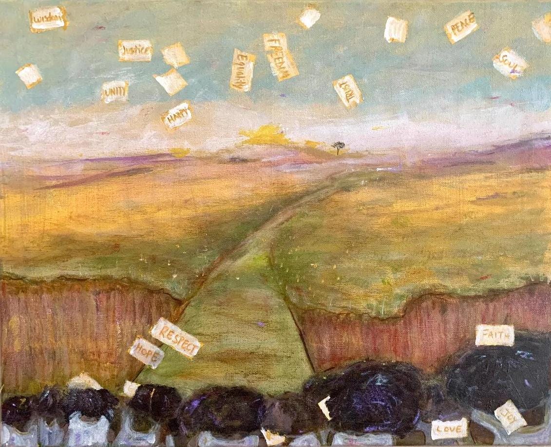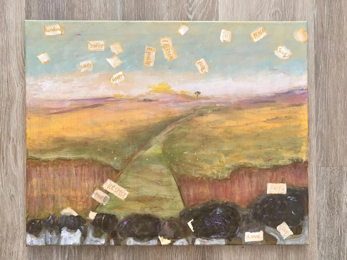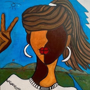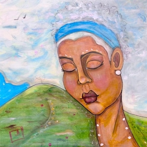 This original abstract figurative painting titled, "Soul Searching” is hand-painted in acrylic on a 20x16 canvas and arrives Ready-to-Hang. The colors I use in this painting are sky blue, summer green, sunflower, light purple, burnt umber, and some black and white. The main themes are on unity, spirituality, and freedom. Signed on the side, full name and date on the back.