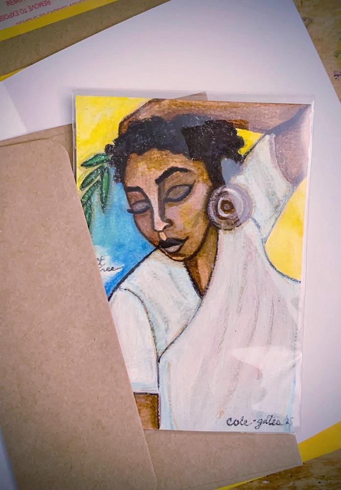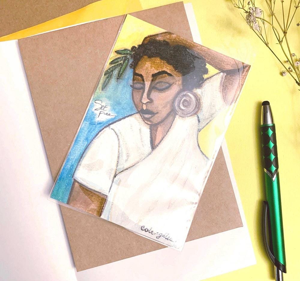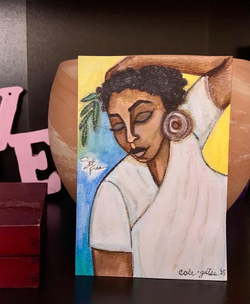 This painting is titled, “Set Free”. It’s created with acrylics, water-based markers, oil paint pens, and watercolor pencils on a 4” x 6” textured watercolor card paper.
