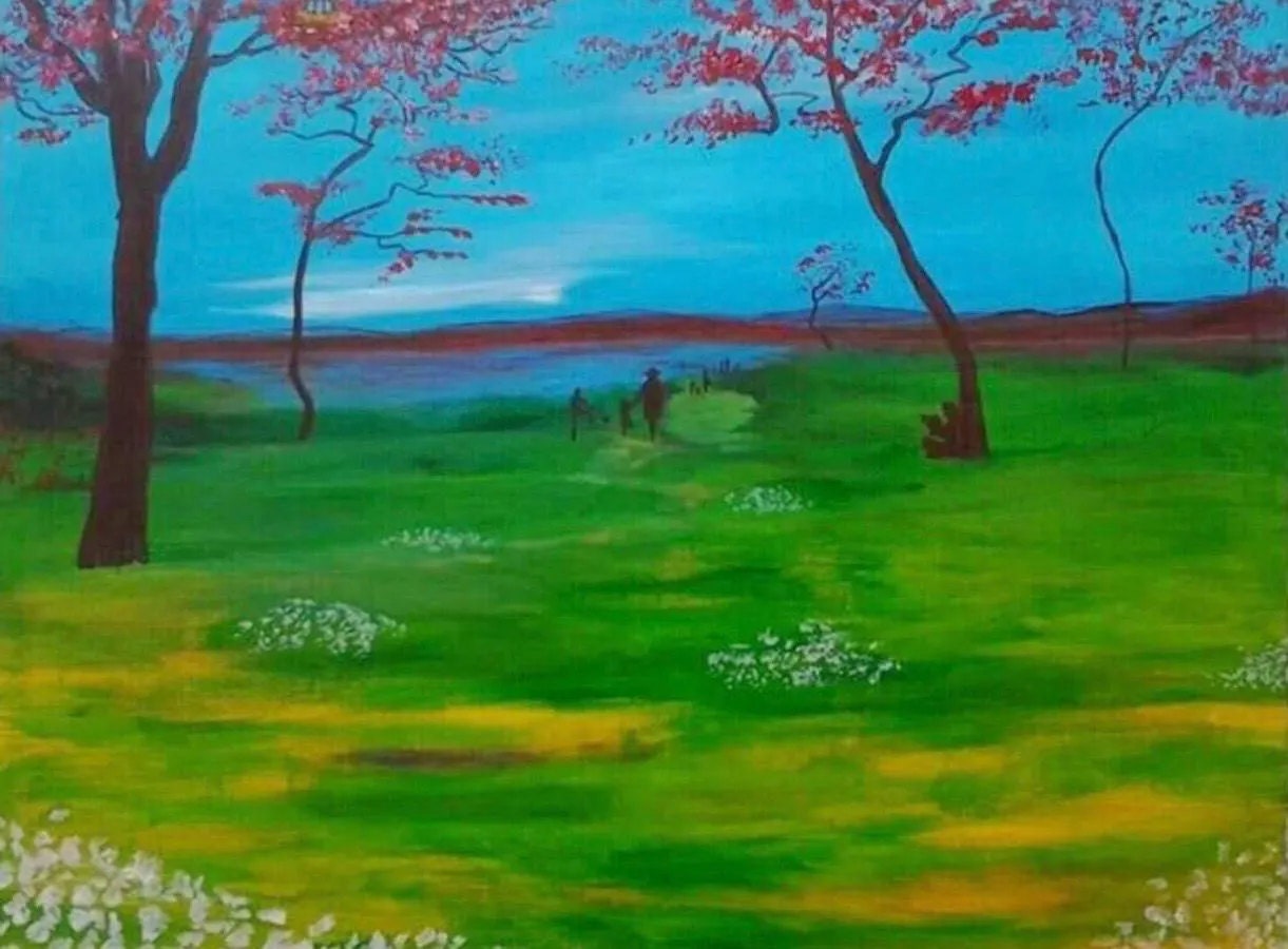 I created this landscape figurative painting in acrylic in 2014 when I was running my own studio gallery in downtown Dayton. Since then it had been hanging on our living room wall, still looking as fresh as the day it was painted. It represents family, fun, and nature in the beautiful parks of Ohio. The cool blues and luscious greens add movement and harmony, while the vibrant red creates warmth and texture throughout the painting.
